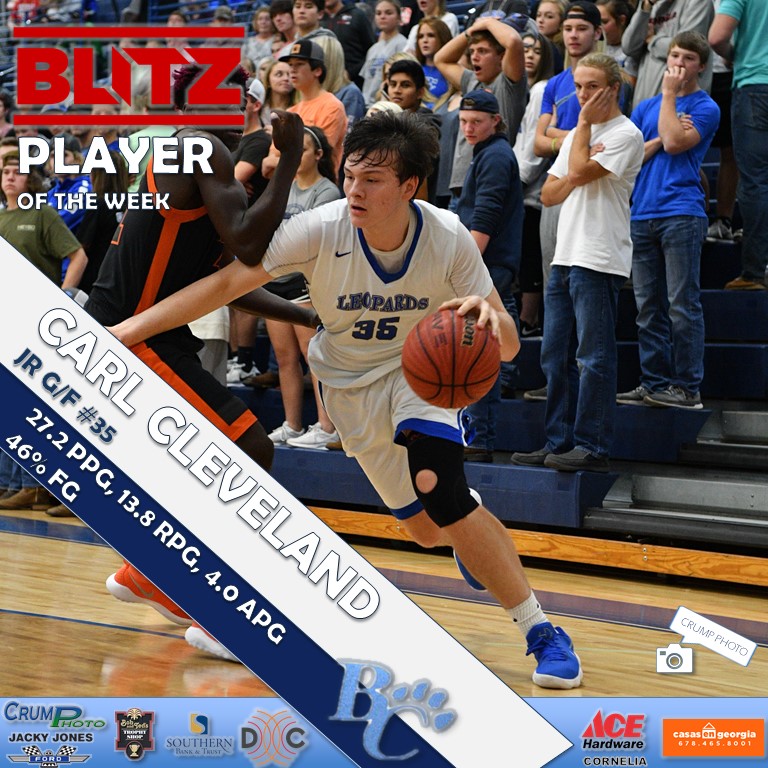 His season includes four double-doubles already and he has scored at least 21 in every game. His 45 points is the highest in known history at Banks County (cannot be verified). For Cleveland, it marks the second Player of the Week award of his career, and he is considered a front-runner for Player of the Year.