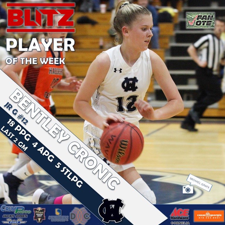 After nearly 16-thousand votes for Player of the Week, the top boy and top girl were each named BLITZ Players of the Week. BLITZ then chose one other boy and girl as a POW winner. It was White County’s Bentley Cronic (7,989 votes) who won the overall vote by a landslide. The top vote-getter for the boys was Dawson’s Luke Chism (2,438). Both won Player of the Week, and BLITZ named Banks County’s Carl Cleveland and Heather Vaughan as well.