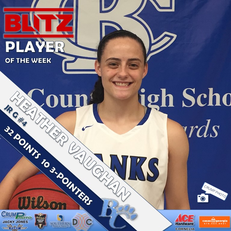 The junior guard for Banks County, Heather Vaughan, has been perhaps the greatest threat from long range among all players in North Georgia. Vaughan was lights out in the past game, scoring 32 points overall, 30 of which came from the parking lot, as she connected on 10 3-pointers. This has become the norm for her, and makes the Lady Leopards perhaps even harder to stop with the combination of a strong inside game as well.