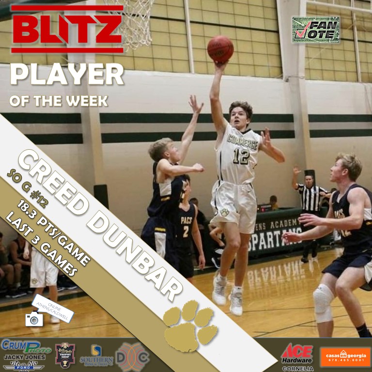 After 31,919 total votes, a pair of Commerce hoopsters nabbed Player of the Week honors. Creed Dunbar (6,933) and Bryanna Sanders (6,736) were the top boy and girl voting recipients, thus winning the Fan Votes. BLITZ then chose Kasin Old (Rabun) and Kaylee Sticker (Dawson) as co-Players of the Week.