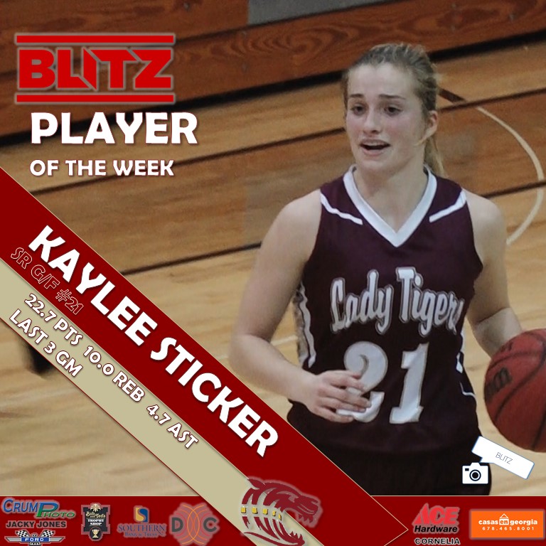 The guard/forward averaged 22.7 points, 10 rebounds, and 4.7 assists over the past three games, including a 27-point performance against North Hall. Her totals included a pair of double-doubles. Sticker collects her second Player of the Week award this season.