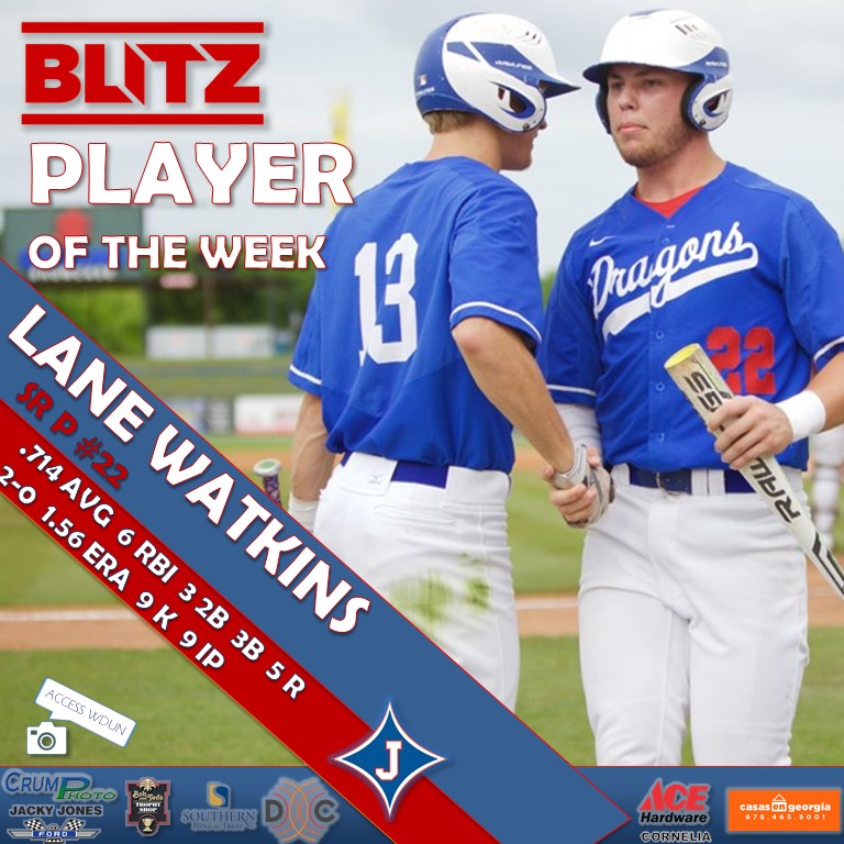 Over a recent three-game set, Watkins tore the cover off the ball at a .714 clip, which included 6 RBI, 3 doubles, 5 runs scored, and a triple. He also went 2-0 with a 1.56 ERA, striking out 9 batters in as many innings pitched. This is Watkins first Player of the Week award, and first-ever for Jefferson baseball as BLITZ began covering the Dragons full athletic program this school year.