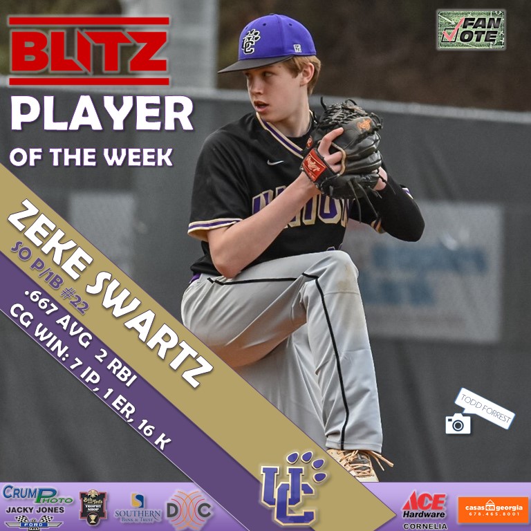 After 6,442 votes were casted, it was Union’s Zeke Swartz who came away with the FAN VOTE BLITZ Player of the Week honors. Swartz tallied 2,600 total votes to edge Commerce’s Colby Rogers, who had 2,095 votes. BLITZ picked Rogers as well as Baseball Co-Player of the Week.