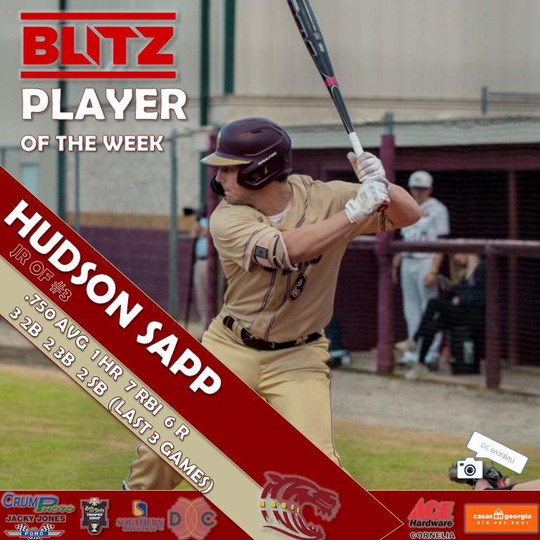 Hudson Sapp earns his second Player of the Week Award this season and third in his career. The junior outfielder and Ole Miss commit hit a blistering .750 in a recent 3-game stretch, bashing a homer to highlight 7 RBI, 6 runs, 3 doubles, 2 triples, and 2 stolen bases as the Tigers face a tough road to the postseason.