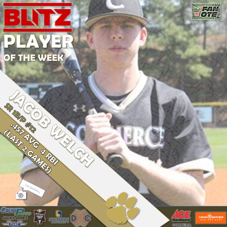 After 10,027 total votes, the overall winner (Fan Vote) was Jacob Welch for the BLITZ Baseball Player of the Week honors with 3,812 votes. He edged Trey McEver of Jefferson, who finished with 3,069. BLITZ then picked Habersham Central’s Alex McFarlane as co-Player of the Week for his efforts.