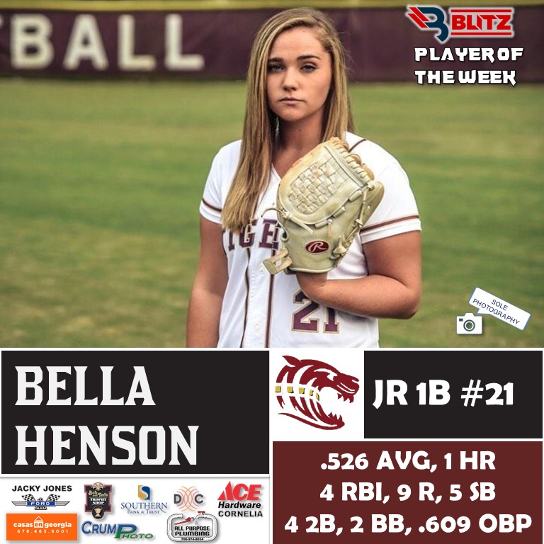 Bella Henson is continuing to take huge strides in 2019, putting up an impressive state line that includes a .526 average, with 1 HR, 4 RBI, 9 R, 4 2B, 5 SB, 2 BB, and a .609 OBP. The junior first baseman earns her first POW award of her career.