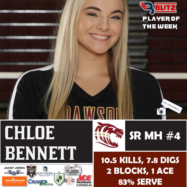 Senior middle hitter Chloe Bennett has been on fire as of late. The Dawson County star has averaged 10.5 kills, 7.8 digs, 2 blocks, and 1 ace per game lately, including netting an 83% serve.