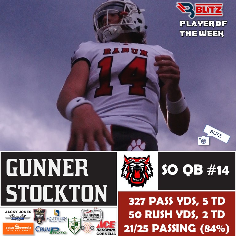 Rabun County’s duo of Gunner Stockton and Sam Adams earned Player of the Week honors. It was Adams who received the most votes in the Fan Vote, closing shop with 3,626 of the total 9,330. It was a close finish, as he edged Habersham’s Jackson Clouatre (3,501). BLITZ then named Stockton Co-POW.