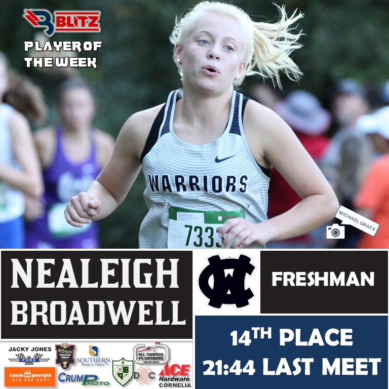 White County freshman Nealeigh Broadwell (3,323 votes) took 50% of the 6,711 total votes to claim Runner of the Week honors, holding off White County boys’ star Eamonn O’Bryant (2,688). BLITZ then named Jefferson’s Katherine Law Co-ROW.