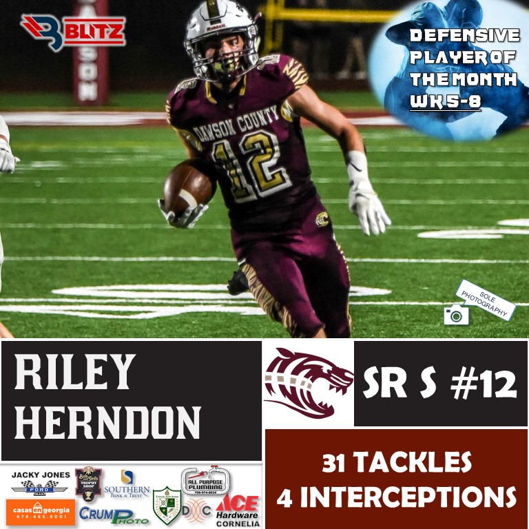 Dawson senior Riley Herndon had a spectacular last few weeks. The #8 Tigers’ defense has been anchored by the safety, who has pickpocketed 4 interceptions, and racked up 31 tackles as of late. One of his picks was a house call for 6 points.