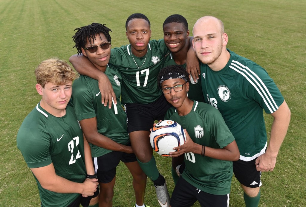 FEATURE PHOTO: Shown, from left, are Samuel Dunlap of Lakemont, David Woods of Miami, Babatomiwa Sofela of Nigeria, Mohammad Kanu of Decatur and Daniel Kasas of Serbia. Front, Maik Murenzi of Rwanda. These six seniors completed their high school soccer careers with a 4-2 route of Brandon Hall on Senior Day.