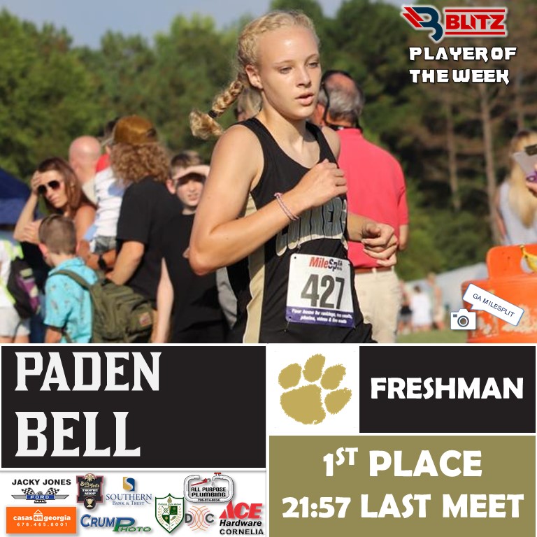 No longer flying under the radar, Commerce freshman phenom Paden Bell finished first place in her most recent meet (Harrier Harvest) prior to the Area Championships. She clocked a 21:57 in the event at Tallulah Falls School. For Bell, this makes her second Runner of the Week award.