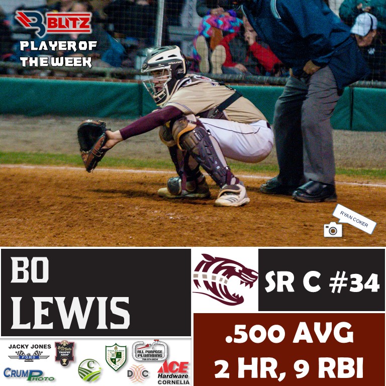 Senior catcher Bo Lewis is destroying the baseball in the early going. The backstop through 3 games last week hit .500 (4-for-8) with 2 homeruns, driving in 9 runs and scoring 6. He also notched 4 walks to earn his first-ever POW award.