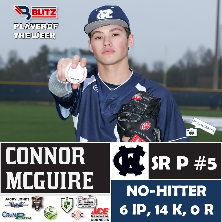 Not to be outdone, White County pitcher Connor McGuire hurled a no-hitter consisting of 14 strikeouts and only 3 walks issued in a win over Clarke Central. The senior earned his first POW award.