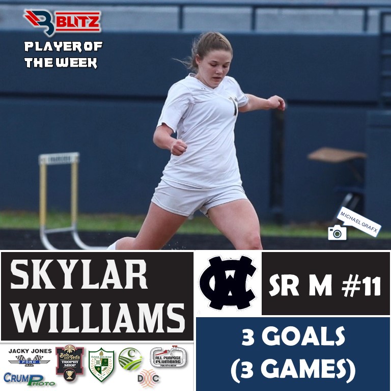 Skylar Williams earns her second Player of the Week award of her career after being the consistent force for the state-ranked Lady Warriors. During 3 games last week, the senior midfielder found the back of the net 3 times.