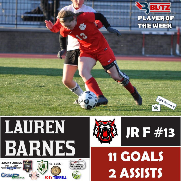 You won’t even believe the numbers that Lauren Barnes put up. The junior striker went OFF for 11 goals and a pair of assists in just two matches last week. She was exceptional in an 8-6 high-scoring win over rivals Union, scoring 7 GOALS and assisting on the other. She followed that performance with 4 goals and another helper in a loss to Social Circle. This is her second career Player of the Week award.