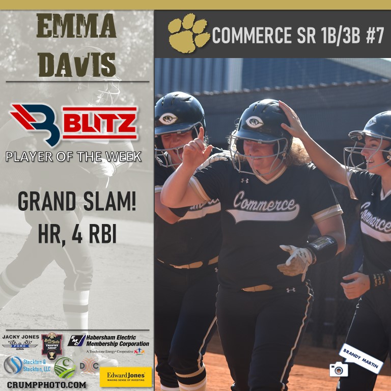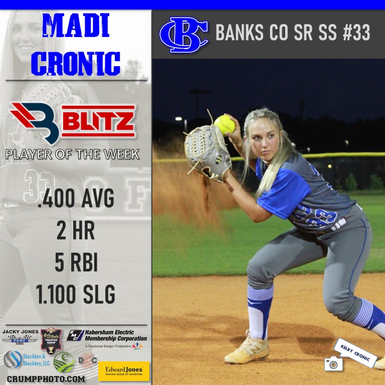 The Player of the Week fan voting reeled in 47,892 votes over 48 hours for Softball Player of the Week. It was Banks County’s Madi Cronic who took the top voting spot with 21,391 votes. Emma Davis (Commerce) was the BLITZ Pick for Player of the Week, and also captured 17,809 votes.