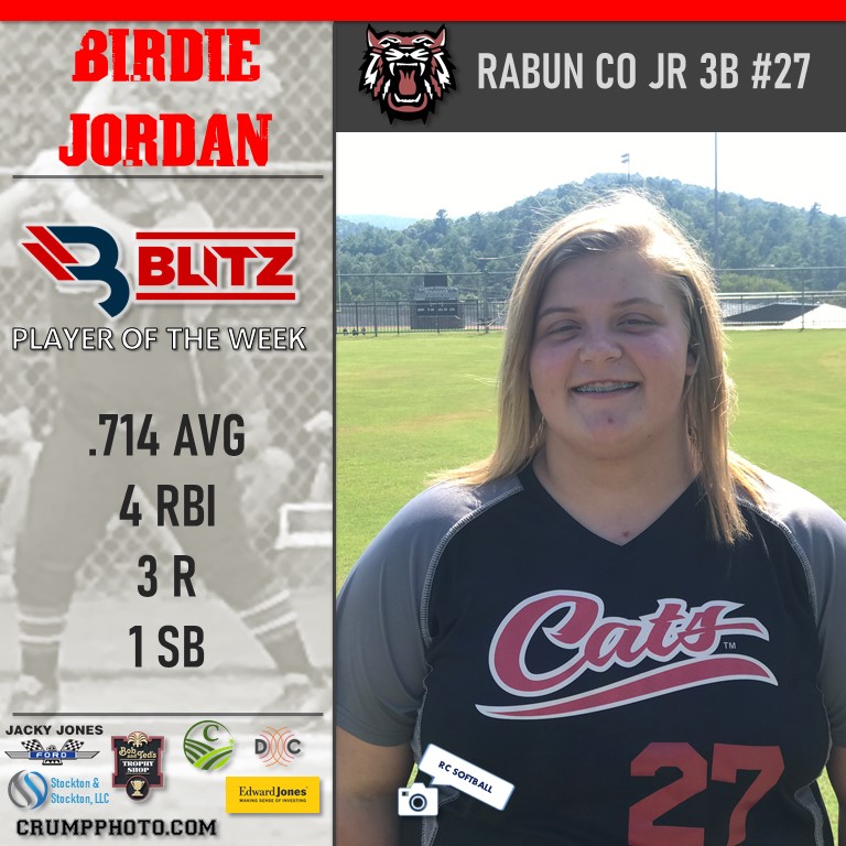 Rabun junior Birdie Jordan had a solid week of play last week, earning her Player of the Week honors. The third baseman hit .714 during play last week, driving in four runs and scoring three times. She also swiped a base.