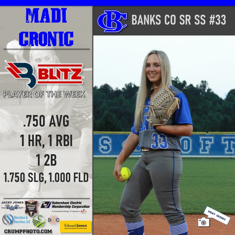 The Player of the Week fan voting totaled 29,082 votes for Softball Player of the Week. It was Banks County’s Madi Cronic who again took the top voting spot with 13,049 votes. Voting runner-up Birdie Jordan (Rabun; 8,100 votes) was the BLITZ Pick for Player of the Week.