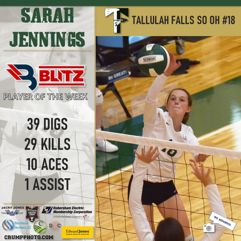 Sarah Jennings had a monster week last week for Tallulah Falls. The sophomore outside hitter tallied 29 kills, 39 digs, 10 aces, and 1 assist in competition last week.