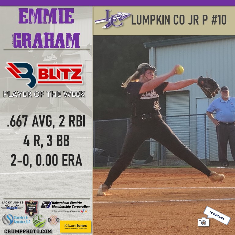 Lumpkin’s Emmie Graham earns POW honors as the BLITZ Pick after having a solid week of games. The pitcher got it done at both ends, dealing in the circle and leading at the plate.