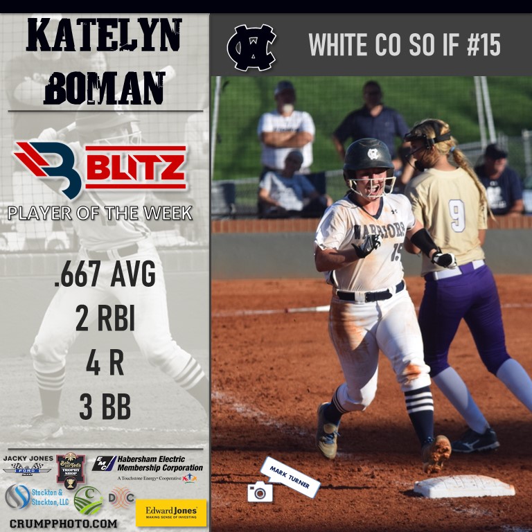 White County’s Katelyn Boman is emerging as a go-to playmaker for Drew Owens and the Lady Warriors. The sophomore infielder had a great week in games played last week.