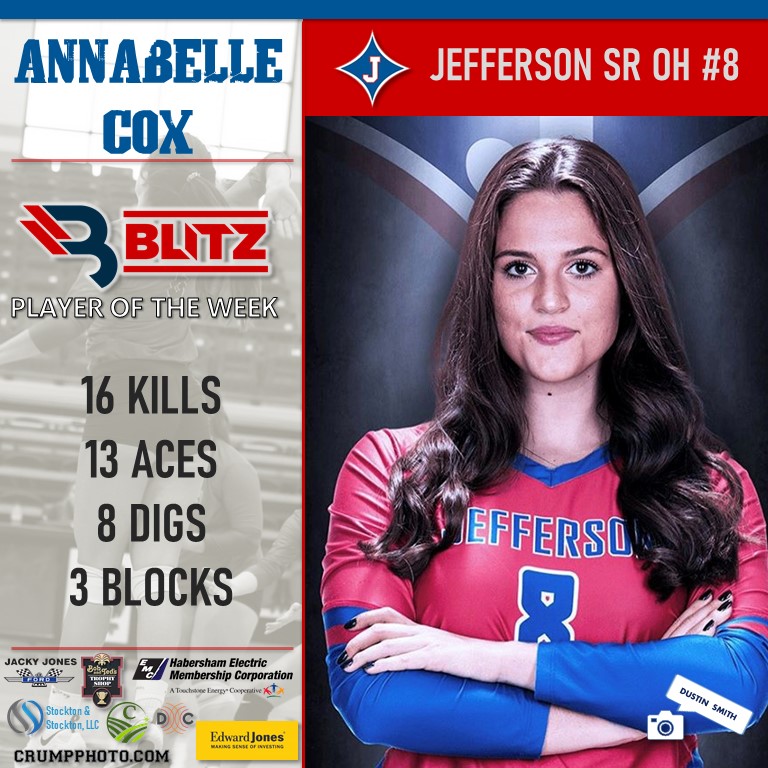Volleyball Player of the Week honors go to Jefferson’s Annabelle Cox (Fan Vote) and Riley Allison (BLITZ Pick). Cox led the fan voting with 6,127 of the 7,993 total votes.