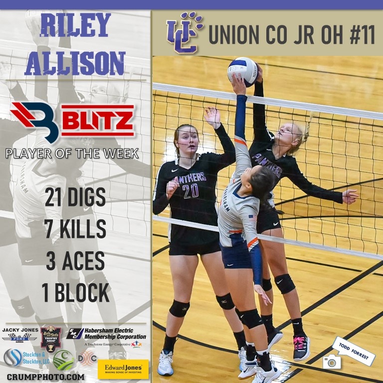 Riley Allison is having a heck of a season at Union County. The junior hitter had a great week of matches last week for the Lady Panthers. She tallied 21 digs, 7 kills, 3 aces, and added a block. This is Allison’s first-ever Player of the Week award.