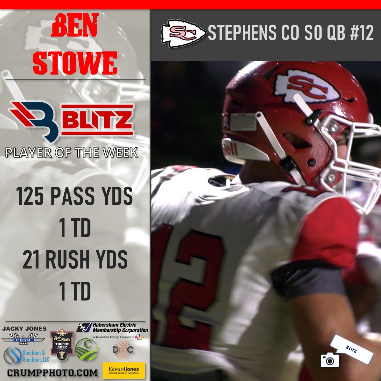 Sophomore QB Ben Stowe has emerged as a viable threat for the Indians’ offense. He’s a large reason why Stephens County is 2-1 on the season. He passed for 125 yards and a TD, and added 21 rushing yards and another TD in a win over 24-10 win over Jackson County. This is Stowe’s first Player of the Week award.
