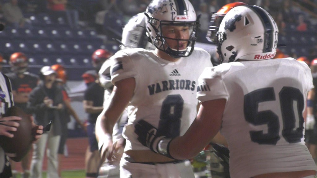 The Warriors scored in the final seconds of the first when Haynes rushed in for the first of his three TDs, this coming from 21 yards out. Midway through the second, Pickett threw a 16-yd TD to Austin Wood, who made a great catch in the end zone to knot the game at 14 apiece.