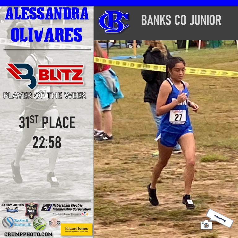 Banks County’s Alessandra Olivares earns her first-ever Runner of the Week award after one of her top performances. She finished in 31st place at the Bob Roller Invitational with a 22:58 time, which was just eight seconds off her PR.