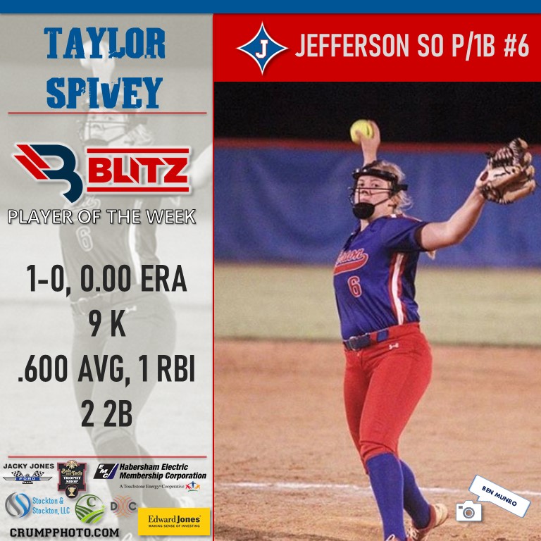 Jefferson standout sophomore Taylor Spivey earned her first-ever POW award after going 1-0 in the circle last week, recording a spotless ERA and striking out 9. At the plate, she hit .600 with an RBI and 2 doubles.