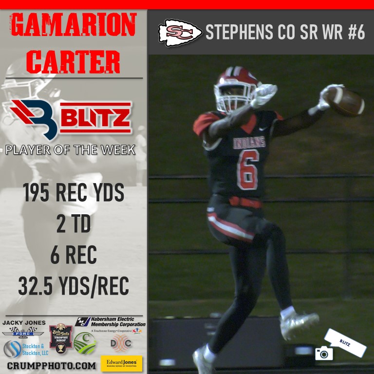 Gamarion Carter had a monster, video-game like performance in a big-time rival win over Habersham Central. As the Indians rolled to a fourth straight win, Carter, a Liberty commit, hauled in 6 passes for 195 yards (32.5 yds/rec), and scored 2 TDs, including the game’s first score in the third quarter, which went for 65 yards. He added a 42-yd TD catch to cap the scoring.