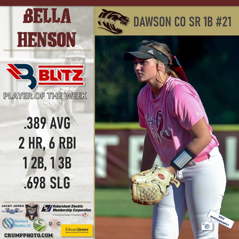 Dawson County senior Bella Henson was ridiculously good last week. She hit .389 at the plate for the Lady Tigers. The first baseman had 2 homers, including a Grand Slam, and had 6 RBI. She added a double and a triple to slug .698. This is Henson’s second Player of the Week award.