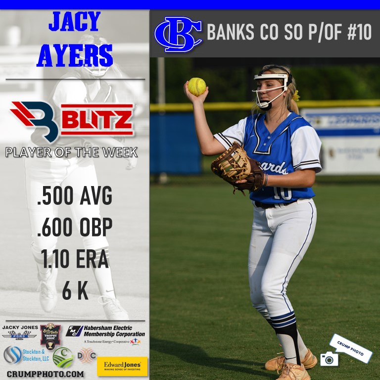 The Player of the Week fan voting totaled 72,419 votes. It was Jacy Ayers (Banks County) who earned the Fan Vote with 33,281 votes, just edging out Anna Taylor (Commerce) who had 31,378. BLITZ then picked Dawson County’s Bella Henson as Co-POW.