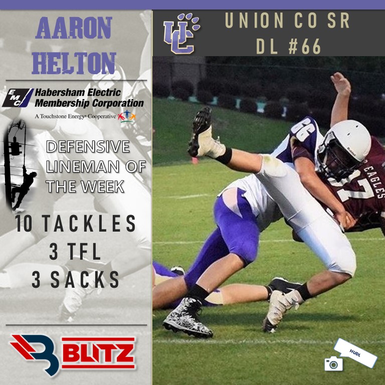 Union County senior standout Aaron Helton had a monster performance for the Panthers in the region win over Banks County. The DL racked up 10 tackles, including 3 for loss. He took down the quarterback often, recording 3 sacks. This is Helton’s first BLITZ award.