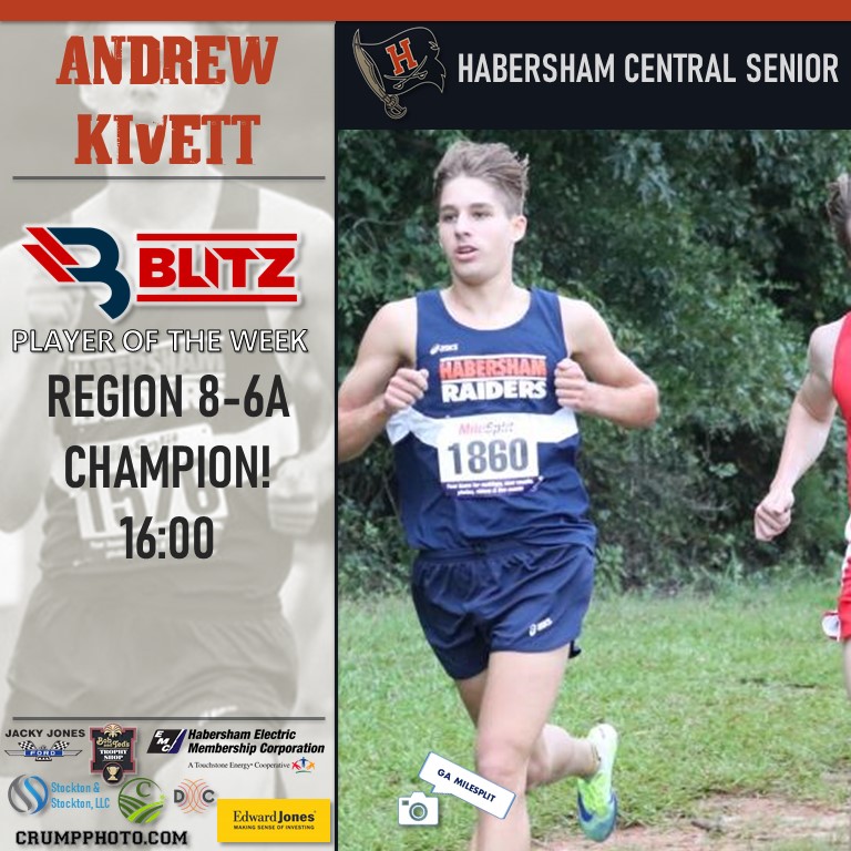 Habersham Central senior Andrew Kivett continues his insanely-good season. He timed in at exactly 16:00 in last week’s Region 8-AAAAAA meet, earning the distinction of a Region Champion. He will represent the Raiders at the state meet coming up in November. This is Kivett’s second Runner of the Week award this season.