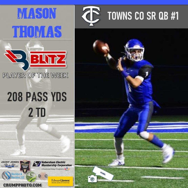The Player of the Week Fan Vote notched 36,916 votes, with Towns County’s Mason Thomas (17,677) earning the lion’s share. He edged out Dawson’s Dakohta Sonnichsen (16,531 votes). BLITZ then named Gunner Stockton (Rabun) Co-POW.