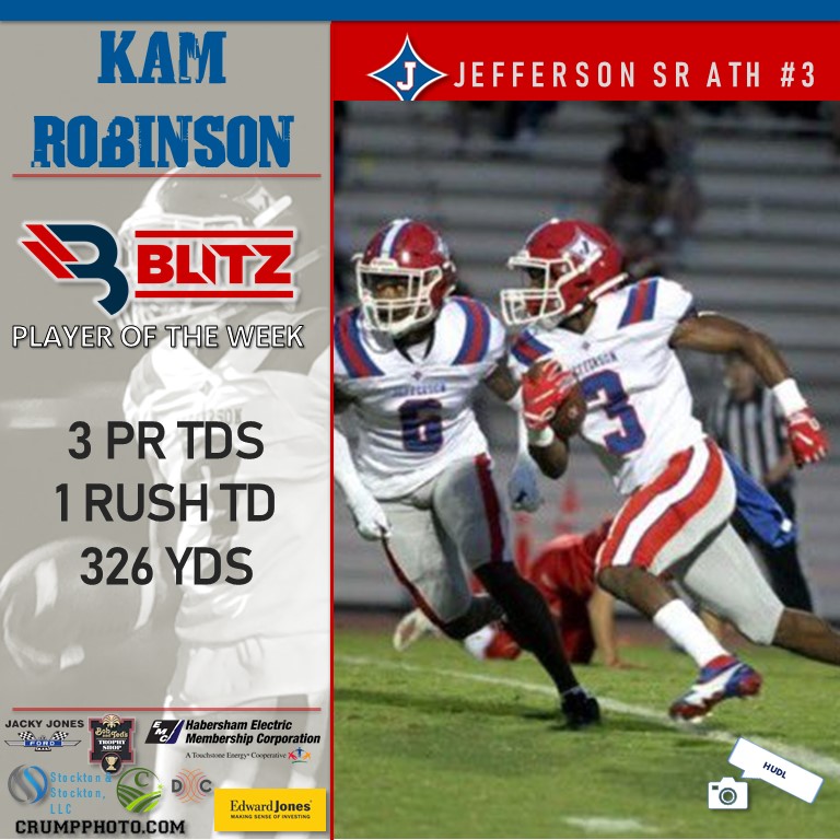 What an absolutely phenomenal performance…it’s being called “one for the ages” as Jefferson’s Kam Robinson dug deep for a series of big-time plays. The senior swiss army knife took THREE punt returns back for scores in the first half alone against Madison County. He also had a rushing TD in the win. His rushing score came from 59 yards out, and his punt returns were for 60, 57, and 59 yards. That’s a grand total of 326 yards, as he recorded other punt returns in the game.