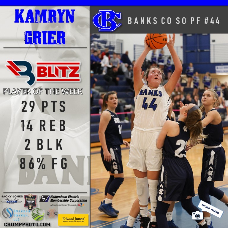 Kamryn Grier had a monster game to open the 2020-21 season for Banks County. The sophomore forward had 29 points and completed the double-double with 14 boards, adding 2 blocks while shooting 86% from the field. This is Grier’s first POW award.