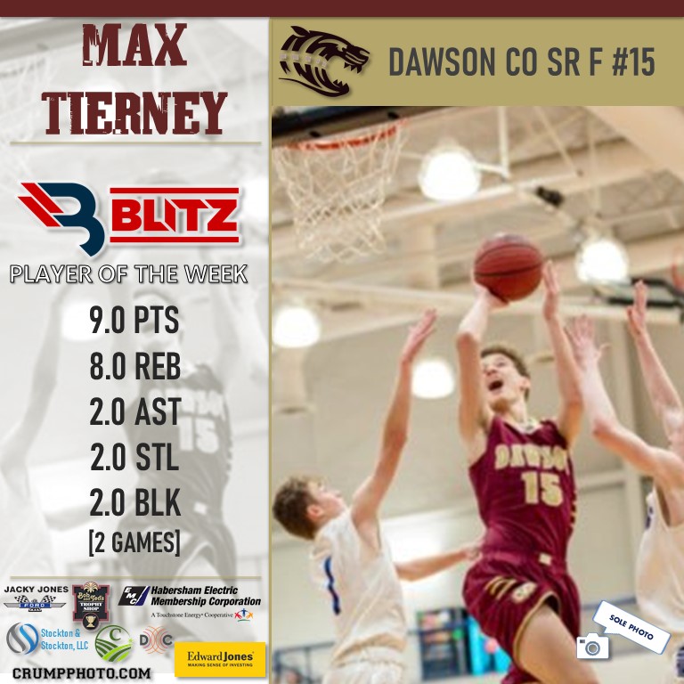 Dawson County senior Max Tierney put up 18 points, 16 boards, 4 assists, 4 steals, and 4 blocks total over 2 games last week for the Tigers. The forward averaged 9.0 PPG, 8.0 RPG, 2.0 APG, 2.0 SPG, and 2.0 BPG as a result. This is Tierney’s first POW award.