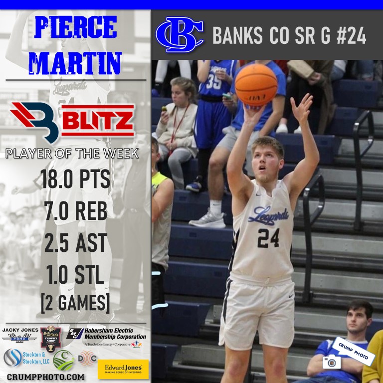 Banks County sharp-shooter Pierce Martin earns POW honors after averaging 18 PPG, 7 RPG, 2.5 APG, and 1 SPG. The senior guard was held to 9 points in a loss to Madison County, but followed it with 22 points in a win over Cherokee Bluff. He had a double-double in that game, hauling in 11 rebounds while dishing out 3 assists. This is Martin’s second BLITZ POW award of his career.