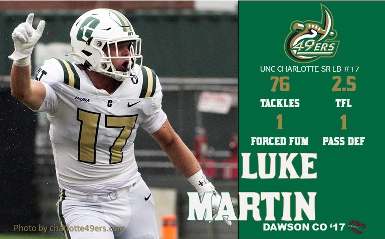 Looking around this corner of the state of Georgia back in 2015-17, you weren’t going to find a linebacker with more love for contact with a motor that wouldn’t stop than Luke Martin of Dawson County. The 2017 product of the Tigers went on at first to Georgia Military College for a hot minute before moving on to UNC Charlotte to play for the 49ers. The rest is history…that continues to be written.