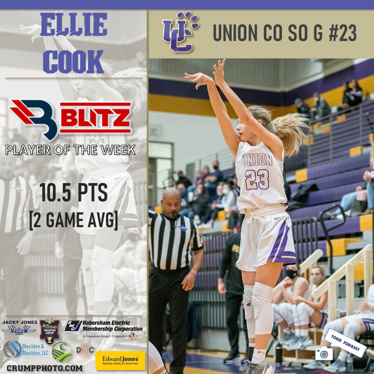 Union County’s Ellie Cook has been an emerging talent lately in Blairsville. The sophomore guard has averaged 10.5 points per game in a 2-game stretch last week. For Cook, that meant 21 total points and her first-ever BLITZ POW Award.