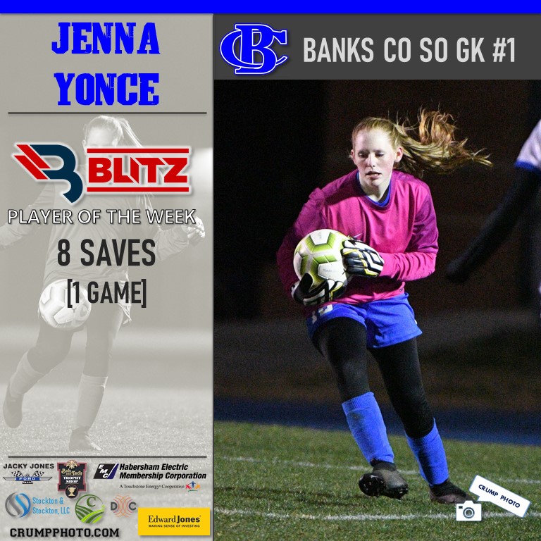 The Player of the Week Fan Vote for combined Girls/Boys Soccer Player of the Week tallied 5,699 votes, with Banks County’s Jenna Yonce tallying 4,421 to win the Fan Vote. BLITZ then picked White County’s Leah Alexander as Co-POW.
