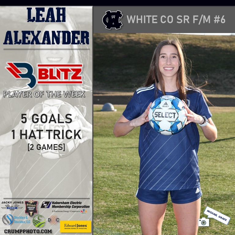 White County senior forward Leah Alexander scored 5 goals across 2 games last week for the #2-ranked Lady Warriors, including notching a hat trick to secure her first-ever POW award.