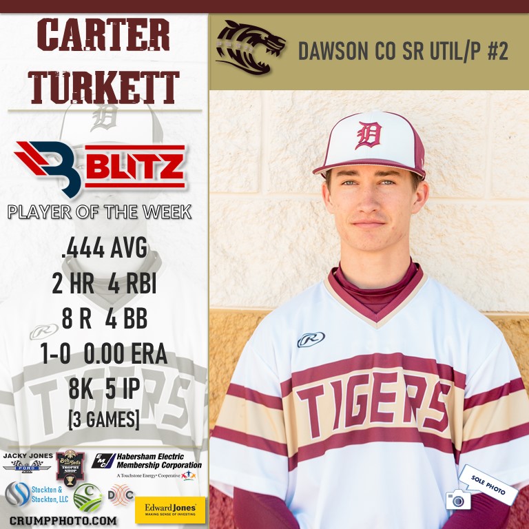 Dawson County senior utility man and pitcher Carter Turkett did it all last week in earning his first POW award. Turkett hit .444 (4-for-9), drilled 2 homeruns and collected 4 RBI. He scored 8 runs and drew 4 walks in 3-game span. On the bump, he fired a 1-hit shutout, giving him a 1-0 mark with a 0.00 ERA. He struck out 8 batters and walked only 2 across the 5-inning start.