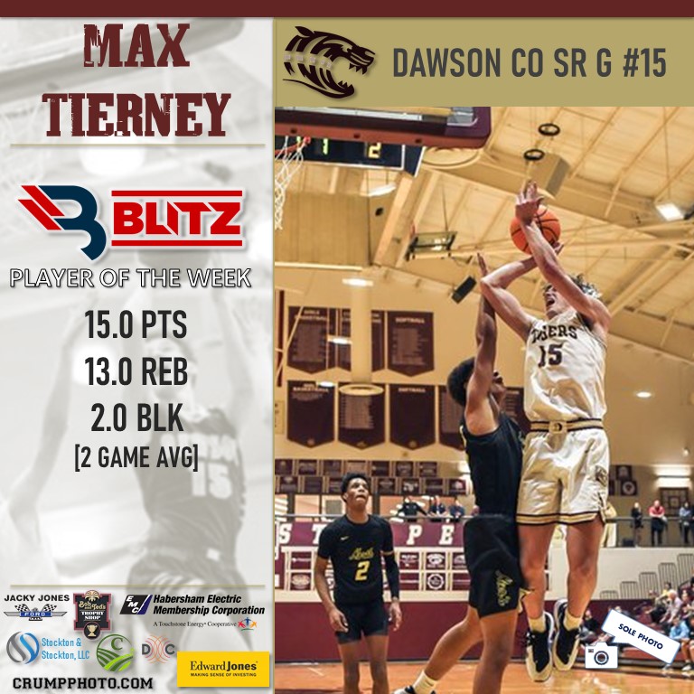 Dawson County senior guard Max Tierney claims his second POW award this season. This time, the Tigers’ standout scored 30 points, hauled in 26 rebounds, and rejected 4 shots over a two-game playoff span. That’s an average of 15 points, 13 rebounds, and 2 blocks per game.