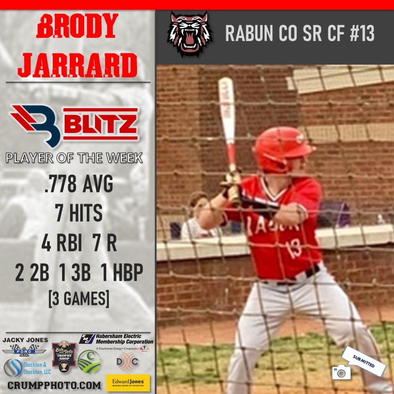 Rabun County star athlete Brody Jarrard takes his first Player of the Week award after a week that saw him hit .778 (7 hits). He had 4 RBI, 7 runs scored, 2 doubles, a triple, and was hit by a pitch. What a week for Brody!