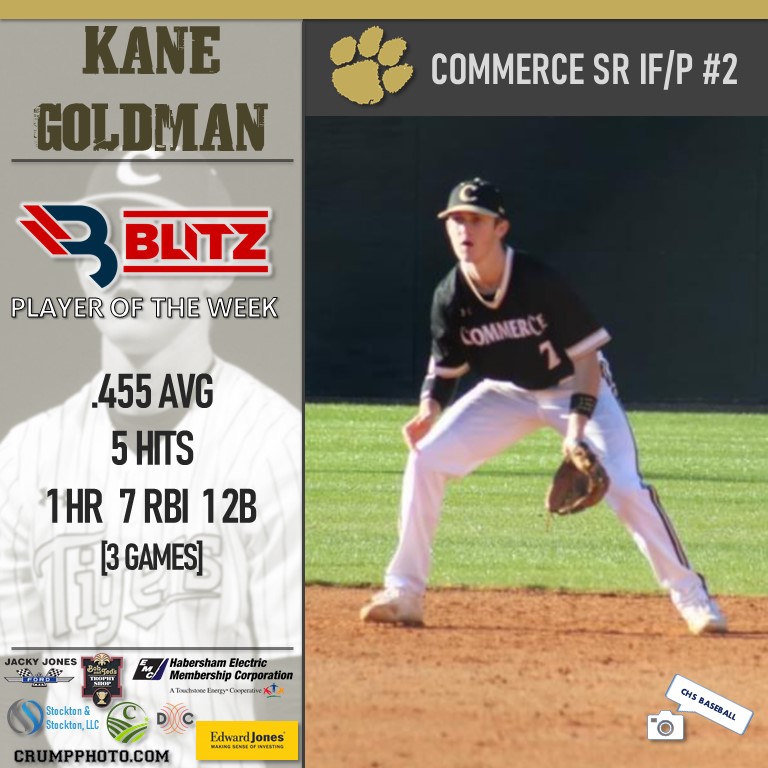 Commerce senior Kane Goldman earns his second career POW award after averaging .455 across 3 games last week, including notching 5 hits. The pitcher/infielder hit a homerun, drove in 7 runs, and added a double for the state-ranked Tigers.